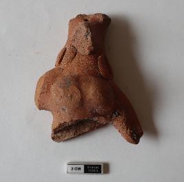 | Description / विवरण | Terracotta female figurine (Naigamesha) with a goat head. Though much mutilated the protruding snout and the raised portion on the head suggestive of horns is clear. The elongated ears are another peculiar feature of the goat headed deity. Below the breast portion is missing. It is red in color |