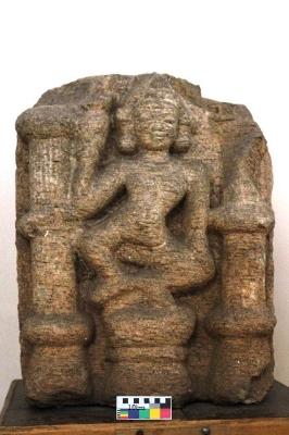 | Description / विवरण | The two armed figure is shown in dancing posture. The right hand of the figure holds an ayudha which is not clear, while the left hand rests on the left knee. The figure is decked with kīriţa-mukuţa, haras and kundalas. The eyebrows, eyes and flat nose are seen clearly. |
