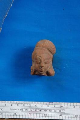 | Description / विवरण | Terracotta head. Hair arranged above and supported by a bands. Forehead injured. |