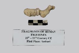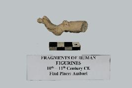 | Description / विवरण | This is a broken fragment of a terracotta human figurine of which only the left leg below the knee has survived. The ankle is adorned with two straps of anklet which looks like beaded jewelry. It is made of kaolin clay. |