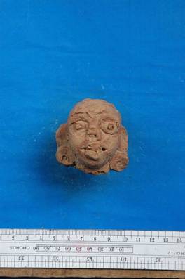| Description / विवरण | Terracotta female head having big eyes and wide ears. Nose lost. She puts on rounded earrings. Lips and right eye injured. |