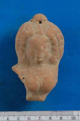 | Description / विवरण | Female bust. Hair arranged and falls at both side of the head. Hands lost. There is a hole at the top. |
