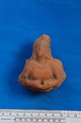 | Description / विवरण | Terracotta figure of a yaksha with its folded hands there is a deep hole in between the folded hands. He wears a pagers with a heavy knot at front. He wears a neck ornament part below belly lost. |