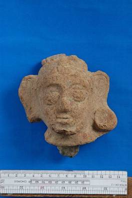 | Description / विवरण | Terracotta head wearing round earrings. Right earring gone. Small tenon at the neck is seen. Left side part of the head gear lost. |