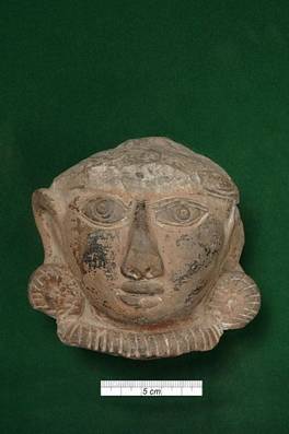 | Description / विवरण | Terracotta female head wearing round incised earrings and necklace spots of the back paint visible on cheeks. |