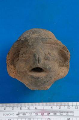 | Description / विवरण | Terracotta head wearing crude features. Mouth wide open. |