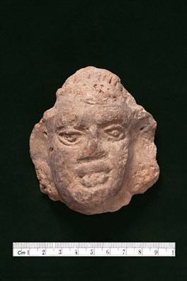 | Description / विवरण | Terracotta head of a male figure. He has long ears with circular doted ear decoration. There is a one hole at the upper part of the ears. Hair arranged in the shape of the of a pagrce. Eyes, nose, cheeks and chin damaged . |