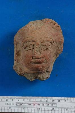 | Description / विवरण | Terracotta head. Ears shown by depressions. Eyes incised. Left eye gone. Nose, ears and part above forehead damaged. |
