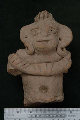 | Description / विवरण | Terracotta male bust wearing a thick applied neck ornament. It has big years and incised eyes. Nose and hands lost. |