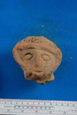 | Description / विवरण | Terracotta head. Eyes incised and no eye balls have been indicated. There is a fillet above the forehead. Urna mark is also seen in between the eyebrows. Silt cut mouth. Crude. |