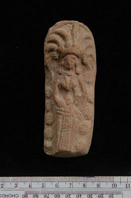 | Description / विवरण | Terracotta plaque showing a standing female figure. The headdress consists of seven sheaves fixed on its. Right hand placed on the waist while the left chopped off. She wears lower garments. |