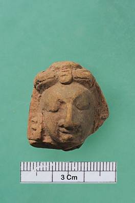 | Description / विवरण | Small terracotta headdress. Left ear lost. There is a hole at the top. |