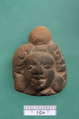 | Description / विवरण | Terracotta head. Hair arranged on either side with a round bump in the centre. Over burnt. |
