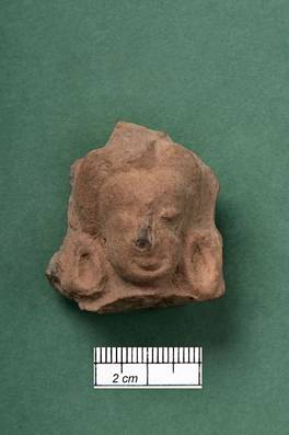 | Description / विवरण | Terracotta head of a female figure. She wears circular earrings. Hair dressed and divided into two parts by an ornament, which is now missing. Nose injured. |