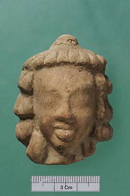 | Description / विवरण | Terracotta head. Hair cut into tiers on sides. Eyes part weatherworn. |