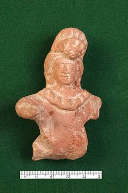 | Description / विवरण | Terracotta male bust wearing a turban coiled on the forehead. He wears an applied thick necklace. Left hand lost while the right one is damaged at the end. |
