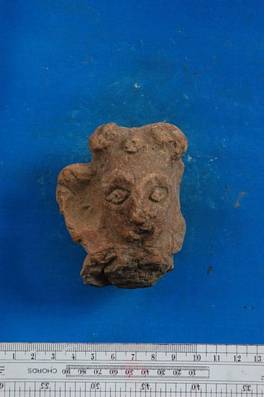 | Description / विवरण | Terracotta head. There are diamond shaped incised eyes on the face. Mouth and chin damaged. Left ear lost. Hair arranged above in two rolls with a round pellet kept in the centre may be a bindi. |