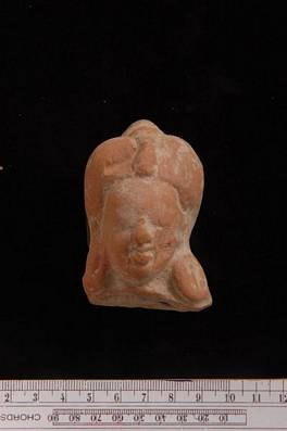 | Description / विवरण | Terracotta head with hair arranged upwards and making a bump above. An ornament attached with the bump in the middle in two parts. Cheeks injured. |
