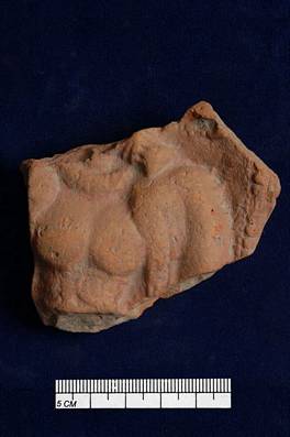 | Description / विवरण | Terracotta plaque depicting a head less bust of a female figure. It has prominent breasts. |
