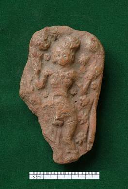 | Description / विवरण | Plaque depicting a standing female figure both of her hands are raised above. Part of the right side below waist gone. |