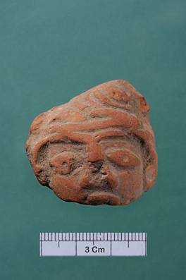 | Description / विवरण | Head of a figure. Hair arranged in spiral locks. Part below mouth gone. |