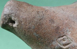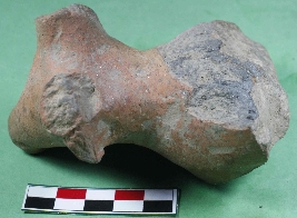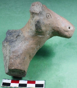 | Description / विवरण | Broken terracotta unidentified animal head with perforation for its nostrils and eyes prominent by incised with pin holes. It colour is dull red. |