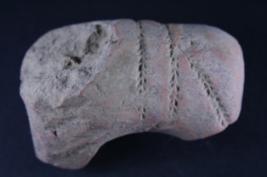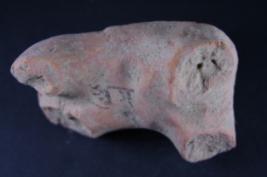 Animal figurine has its head damaged, legs are also broken and impression of leaf motifs are clearly visible on its surface.