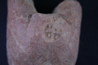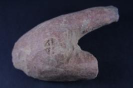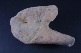 Animal figurine has half of its body missing, legs are broken, impression of a wheel is found on its surface.