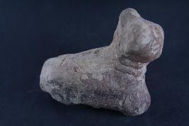 Animal figurine has its face and two earlobes clearly visible. Lines are given at neck, and legs are damaged.
