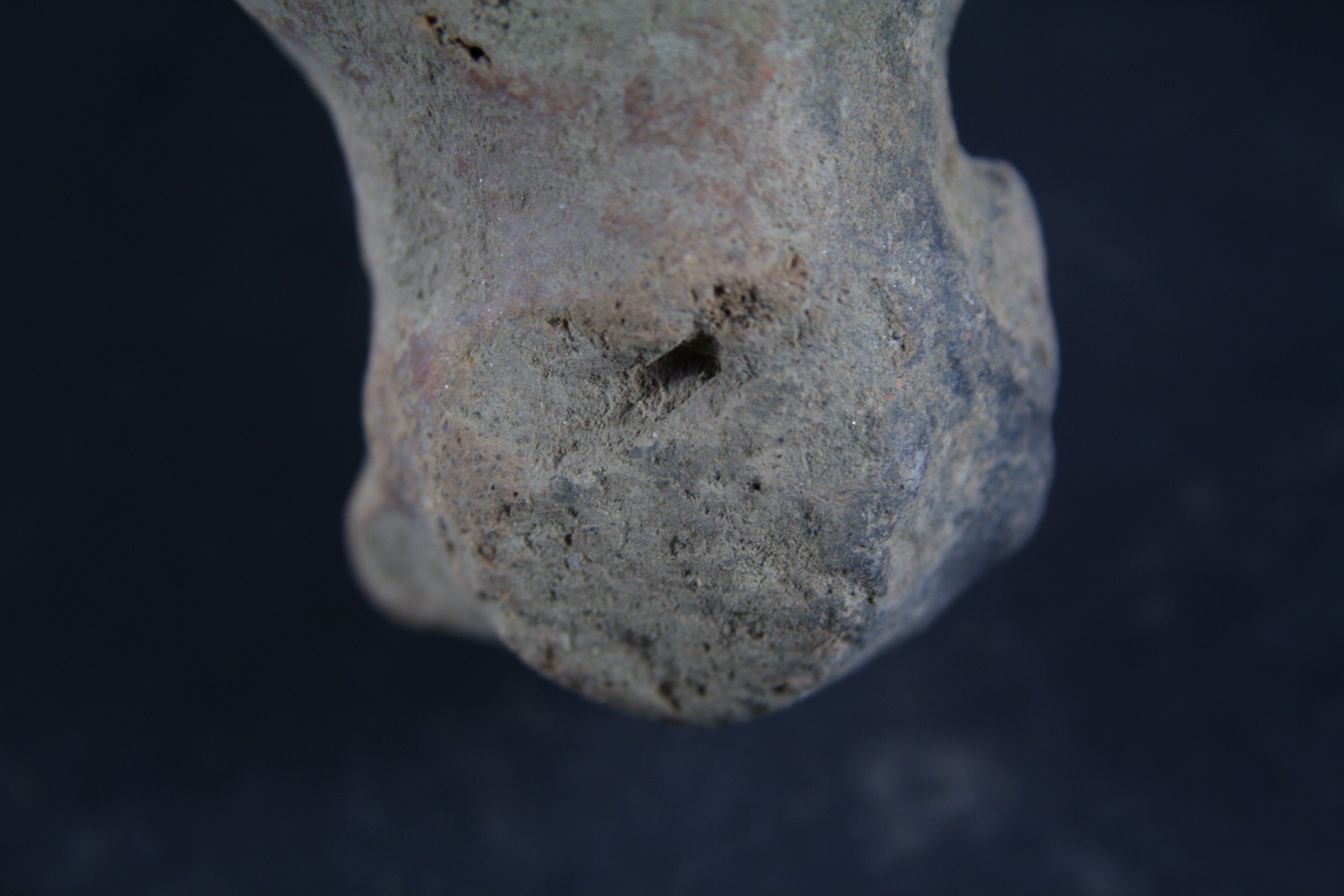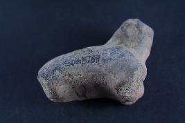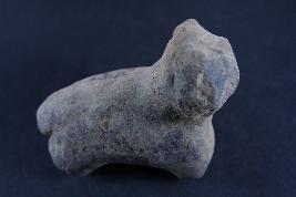 Animal figurine has a curved body, head is prominent and legs are missing.