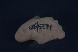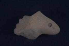 Animal head with protruding and curved face, a small circle is on the surface most probably to mark an eye.