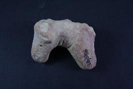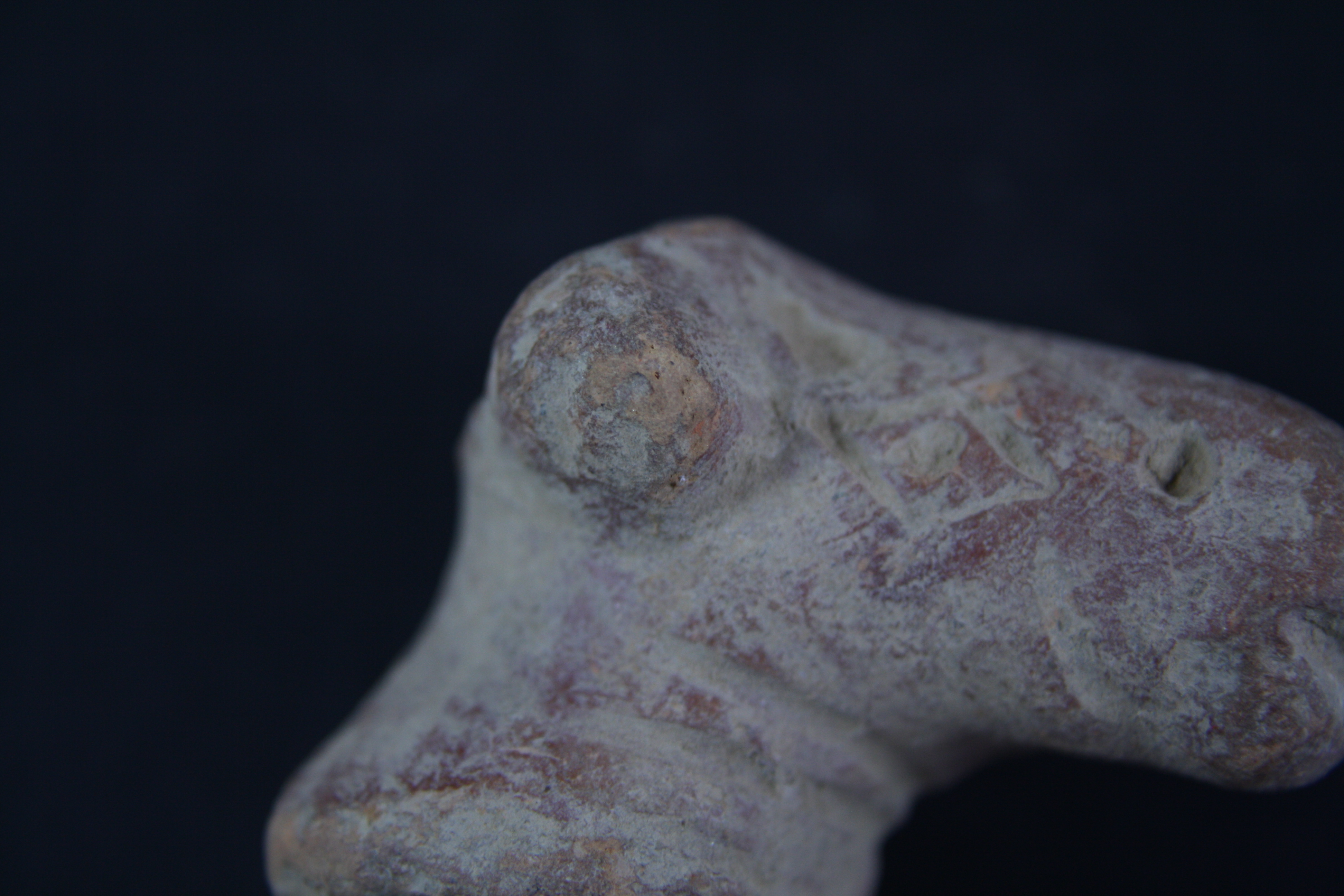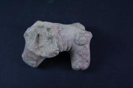 Sheep figurine has face turned downwards, surface is badly dirty and damaged, pointed eyes are marked on its surafce.