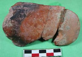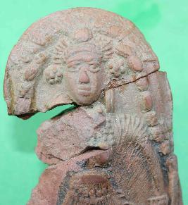 | Description / विवरण | Terracotta probably yakshini standing in position with prominent eyes,nose,lips and kundalas in the ears, beaded ornament on the forehead are shown very nicely,one hand hanging down wear incised bangles. It wears a long dess and of red colour. |