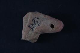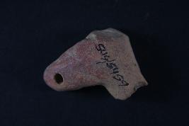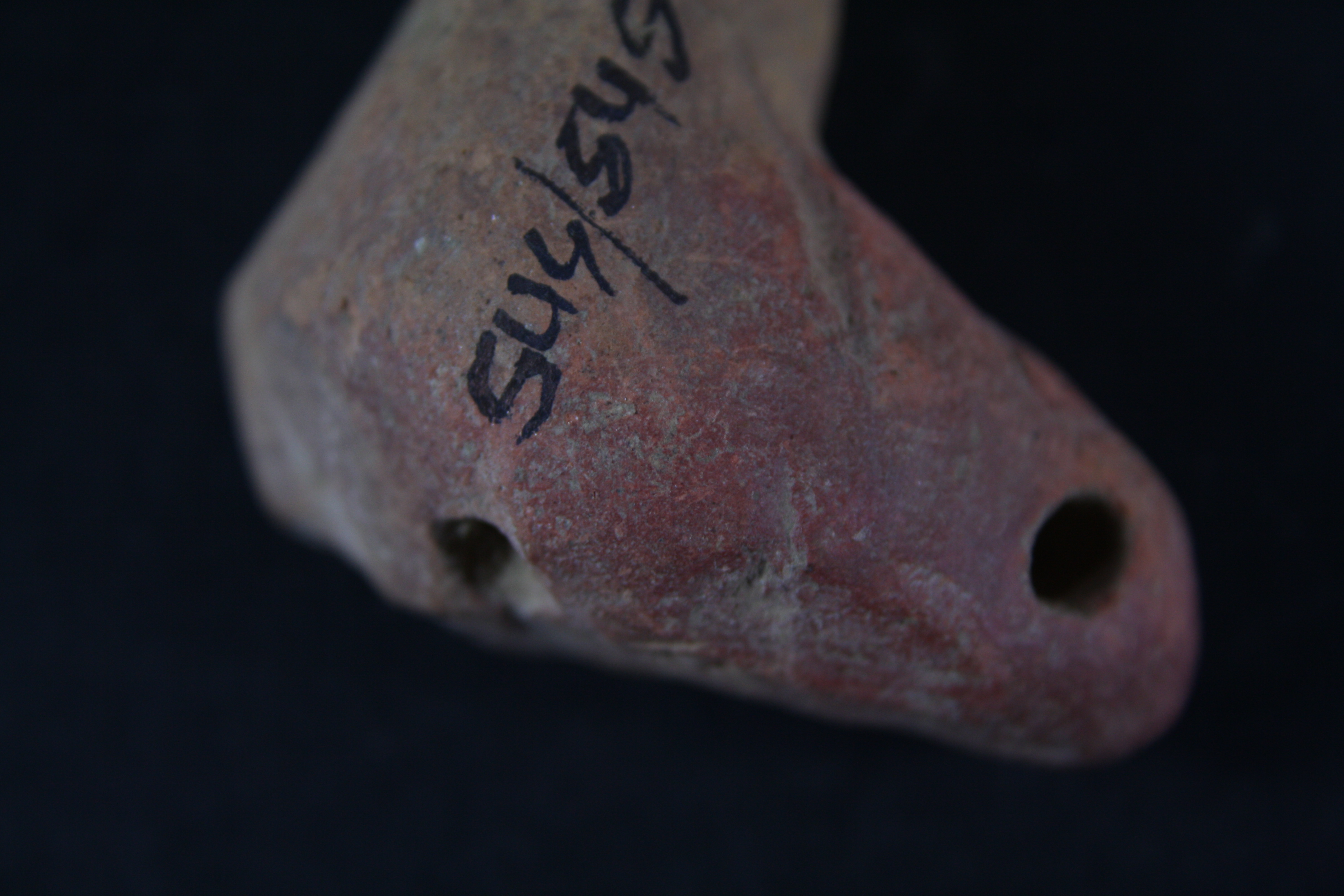 Animal head has a pointed face and a broken neck, a hole and a pit are ther on the surface.