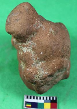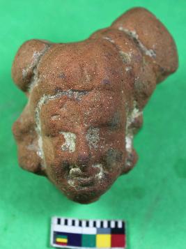 | Description / विवरण | Fragment of a Human figurine with prominent incised facial features . It also has headdress, having smooth surface. It is red in colour. |