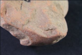 It s an animal figurine made of terracotta. Colour is ochred and not well fired. Features are not clearly visible and badly damaged. Surface is rough and deposition of dust.