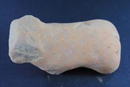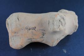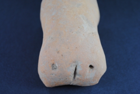 An animal figurine with broken legs and damaged face, two holes are visible at the back.