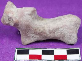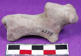| Description / विवरण | A bull figurine with prominent snout and tail.Its hump and legs are made by pinching the surface.Horns are damaged. It has smooth surface and is dull red in color. |