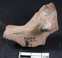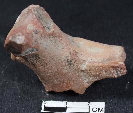 | Description / विवरण | A fragment of unidentified animal figurine with broken snout, one horn and back body. Its front legs are thick and intact. It has smooth surface and is red in color. |