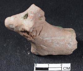 | Description / विवरण | A fragment of unidentified animal figurine with snout and horns. Its half of the body is mssing. It has perforation on head and a smooth surface . It is red in color. |