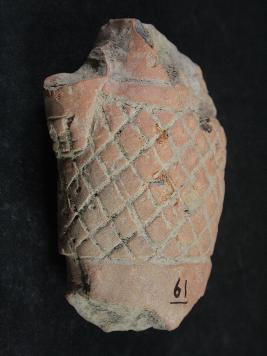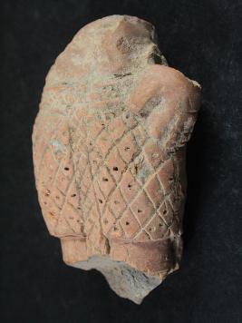 | Description / विवरण | It is a human figurine made of terracotta. Colour is ochred & not well fired. Wearinng belt & incise lines, checked design, pinned on it. Upper & bottom portion are lost. Rubbing on the surface |