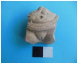 | Description / विवरण | Fragment of a nude female figurine from the waist to the thighs with a prominent navel and a girdle round the waist. Fragmentary abdominal portion of a female figure. The genital features are adorned with girdle. An ornament is visible above the naval, probably the necklace. |