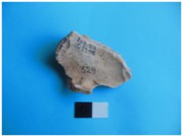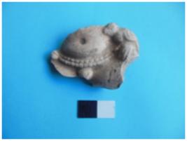 | Description / विवरण | Fragment of a human waist with a prominent naval and the girdle. A parrotis depicted or a dove is seated on the arm. |