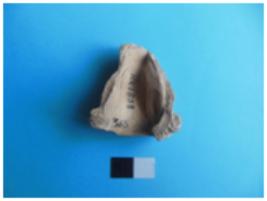 | Description / विवरण | Fragmentary back portion of a human head with the hair arranged in two locks following on the ears where they are twisted. Some protruding ornament in the center of the head. |