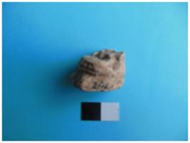 | Description / विवरण | Fragment of a human leg with an anklet. Toes and the fore foot chipped off. |