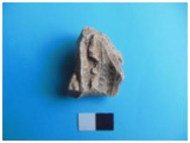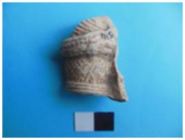 | Description / विवरण | Fragmentary head back portion only with stamped crisscross design below the head band. |
