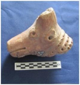 | Description / विवरण | Animal head having three grooved lines on his neck. There is transverse hole across its mouth for passing a thread. Both horn and ears are broken. |