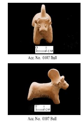 | Description / विवरण | A humped bull figurine of drab fabric has eyes formed by pierced holes within incised lozenges and ears by an incision. Muzzle shows two nostrils formed by piercing holes and month by a incision. Pin-holes a holes can be seen round the neck. Horn and legs are broken. No tail but hole can be seen out the back. Hand modelled. |
