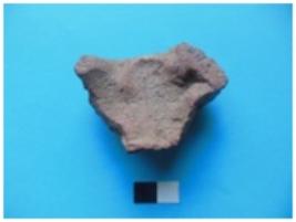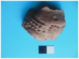 | Description / विवरण | Fragmentary waist of a human figurine with a girdle shown by a two rows of punched circlets. Red in colour. |