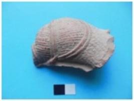 | Description / विवरण | Fragment of figurine designed with slanting lines enclosing dots and stamped crises cross pattern. Red in colour . |
